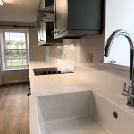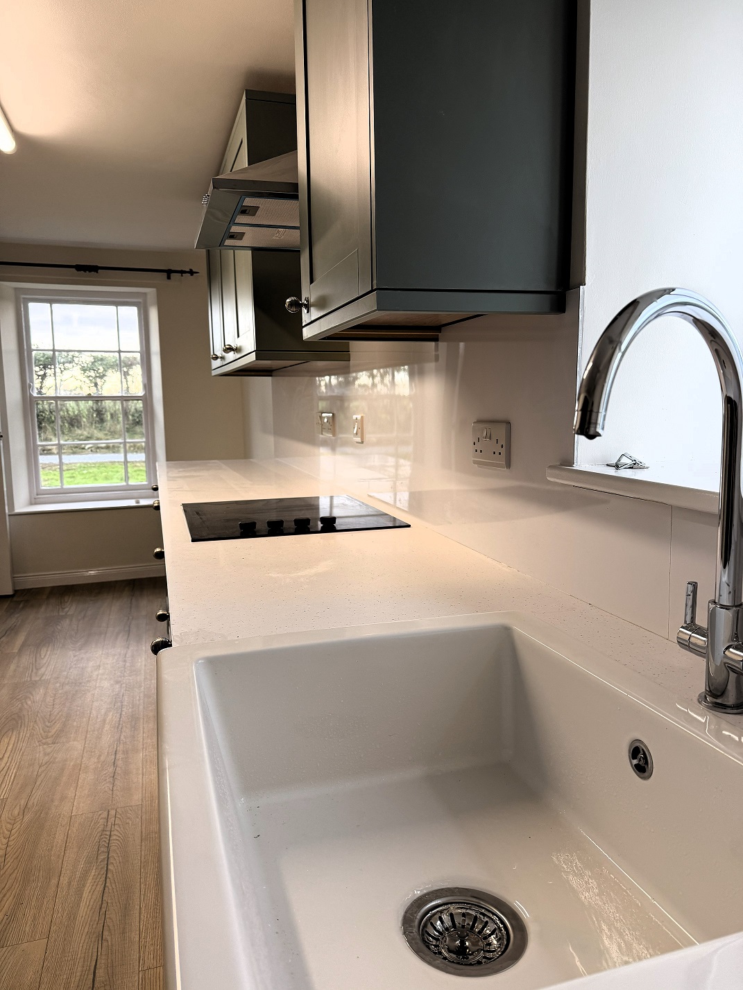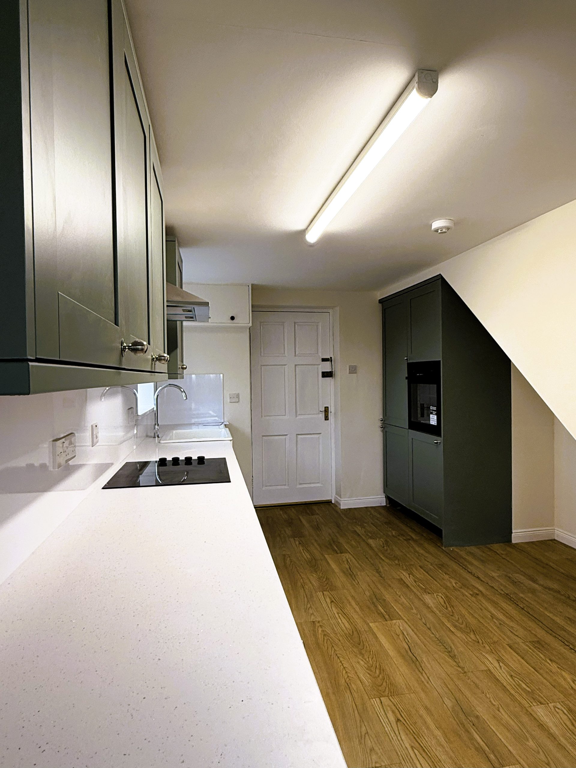 Brand-new, high and low level units with storage. Integrated fridge, washing machine and cooker. Belfast style sink. New vinyl flooring
