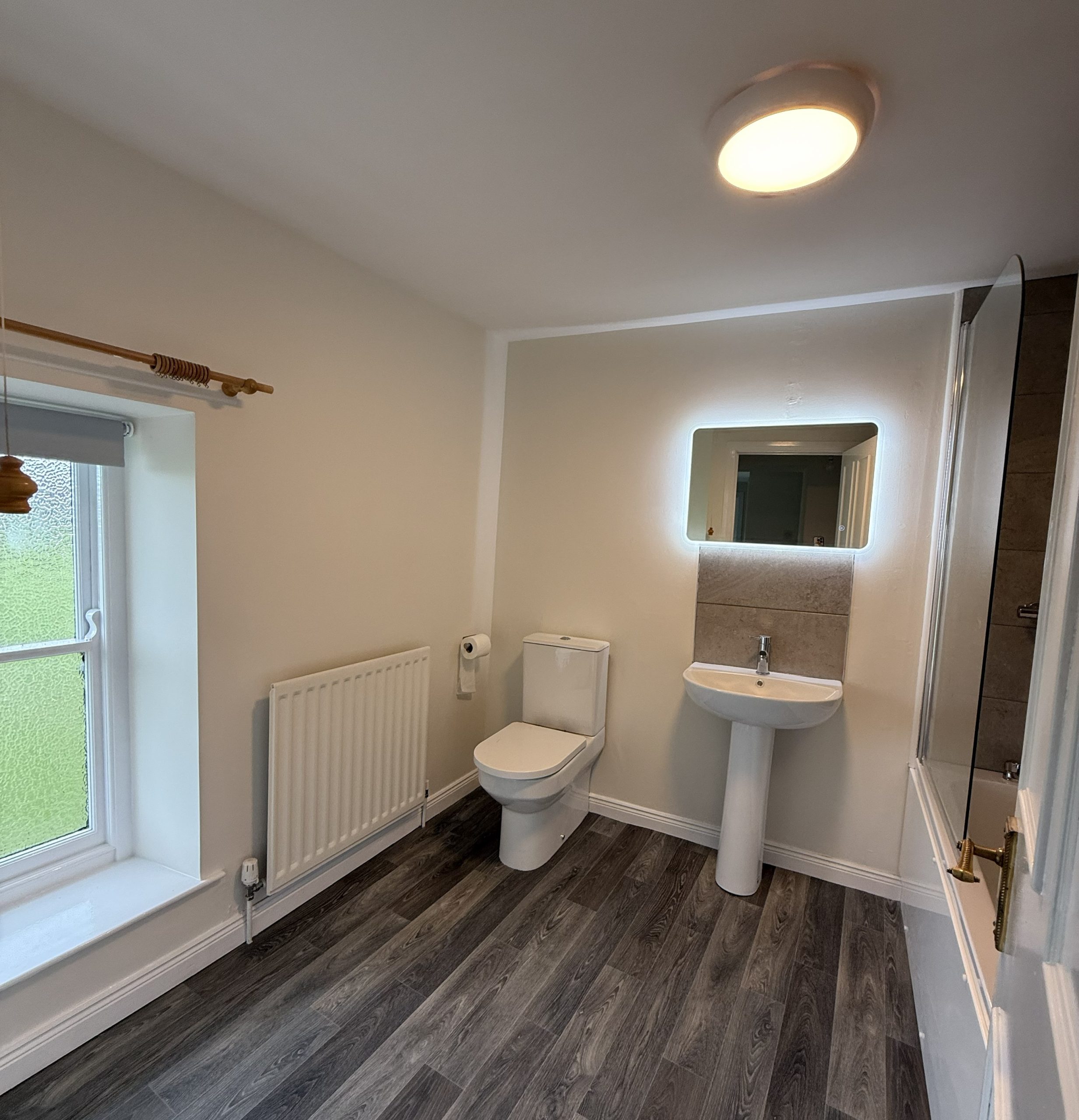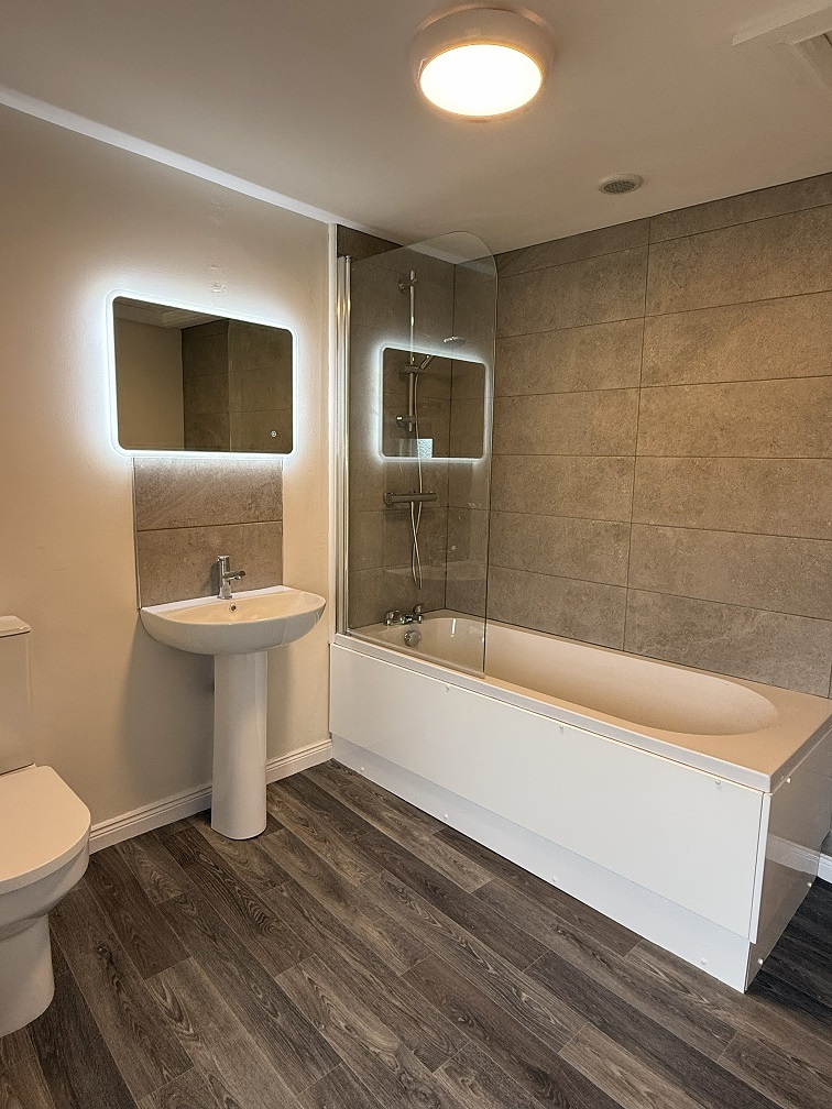 Newly installed bathroom suite. Mixer taps. Illuminated mirror. Newly fitted vinyl flooring.