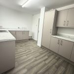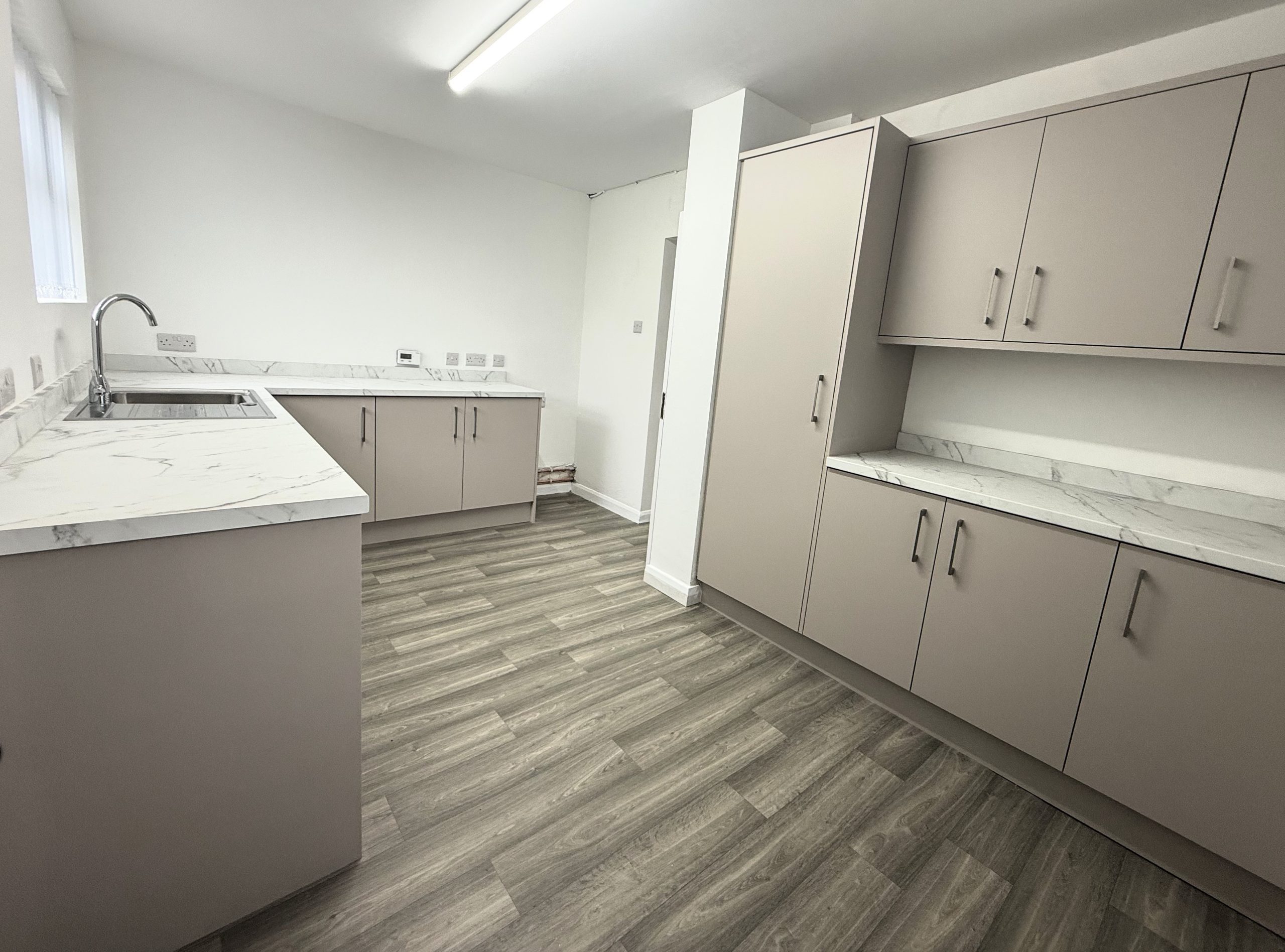 Newly fitted high and low storage cupboards, large larder cupboard, space for washing machine, tumble dryer and fridge.