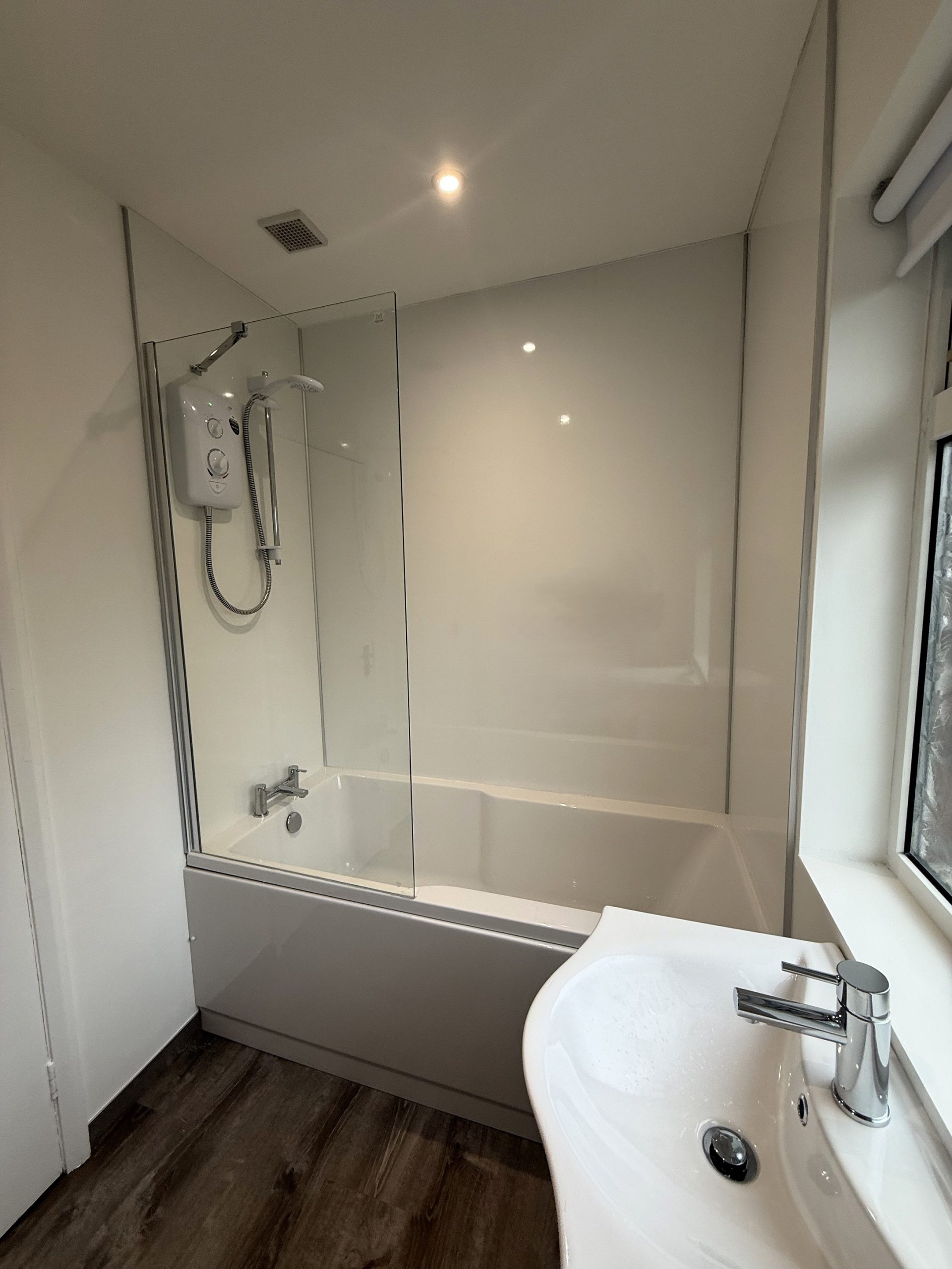 Newly fitted white suite, bath, toilet and wash hand basin with storage, Mira Sprint electric shower.
