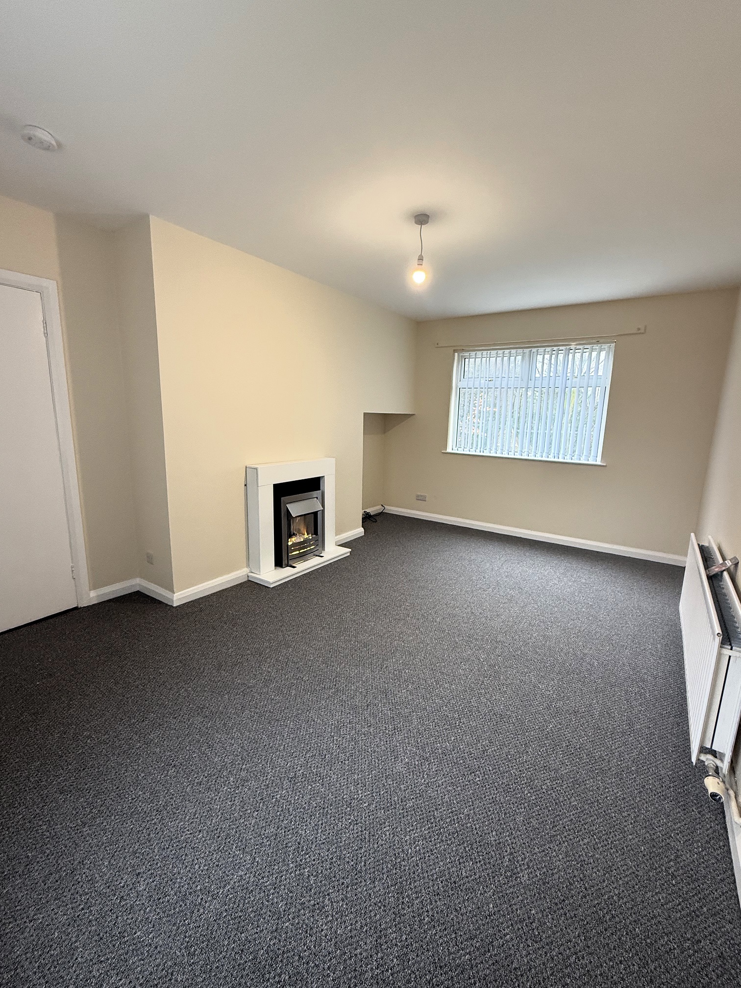 Fireplace with electric fire, newly fitted carpet.