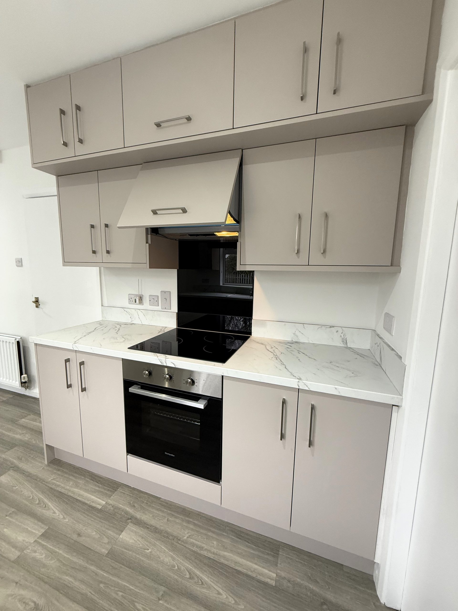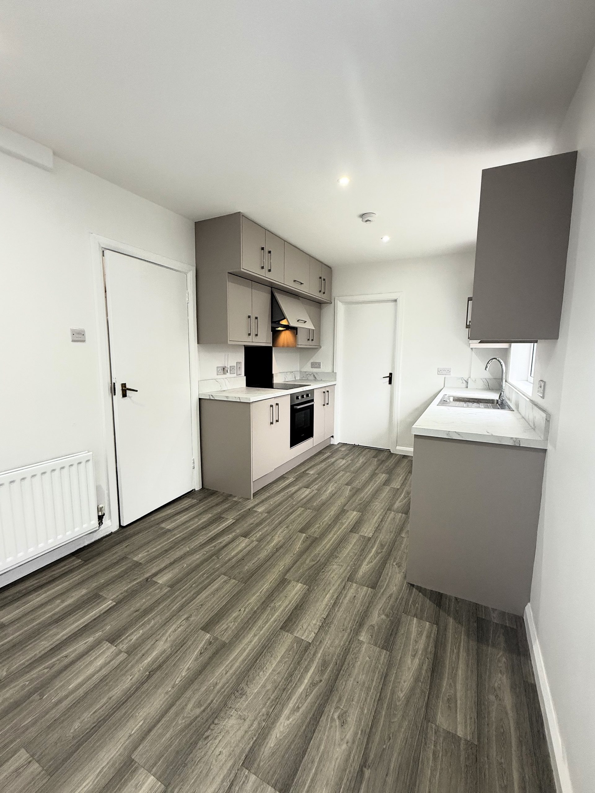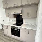 Newly fitted high and low cupboards, induction hop with Montpelier oven. Area for dining.