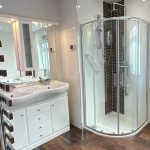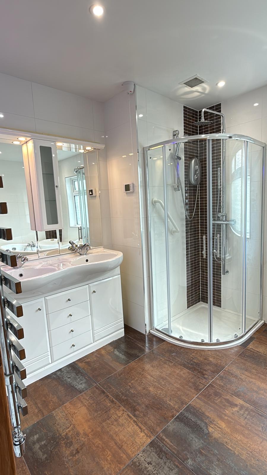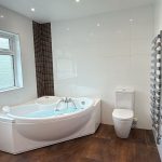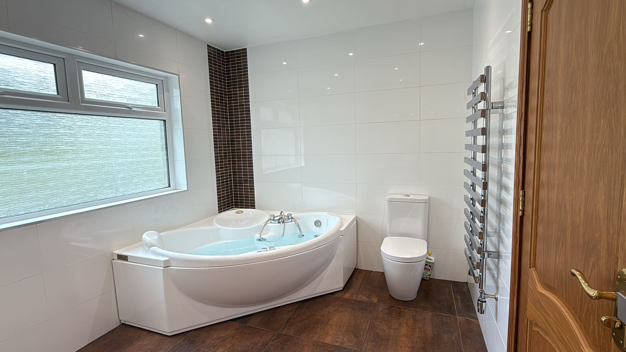 Jacuzzi corner bath, fully tiled shower cubicle with multi jet shower, twin sink units with mixer taps, low flush WC, fully tiled walls, ceramic tiled floor, 2 x chrome towel radiators, cozy toes underfloor heating.