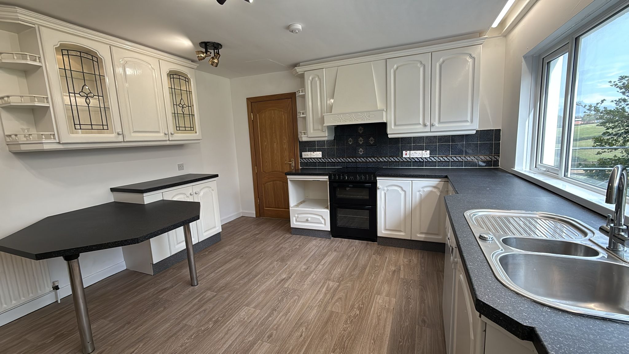 Full range of high and low level units, stainless steel 1.5 tub sink unit with mixer taps. Plumbed for dish washer, recess for fridge freezer, double cooker with ceramic hob.